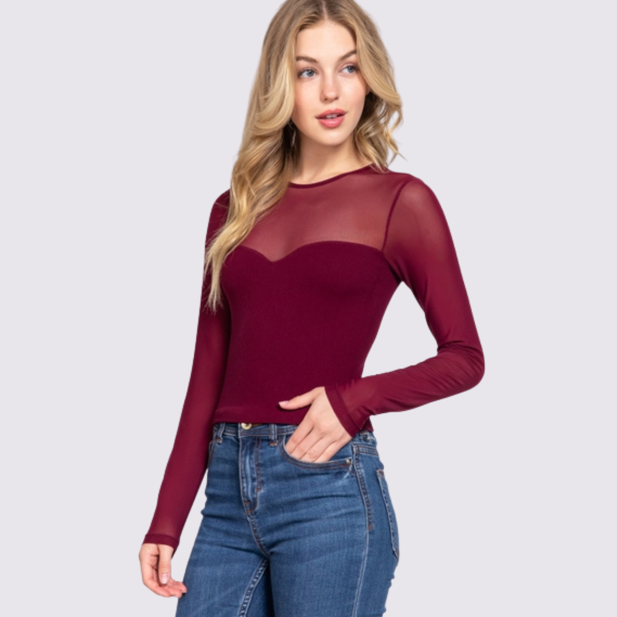 - Make a bold statement in the Stacia Top a burgundy mesh top, featuring a romantic sheer sweetheart neckline and long sheer sleeves. The seamless design and delicate mesh detailing create a modern, sculpted silhouette that’s both edgy and elegant. Perfect for pairing with high-waisted denim or layering under a blazer for a night out.