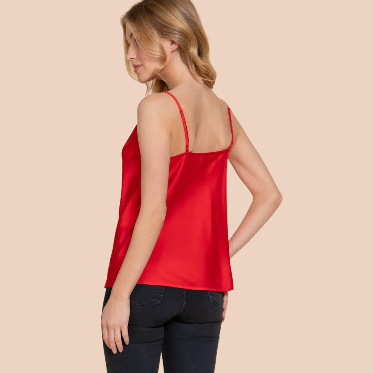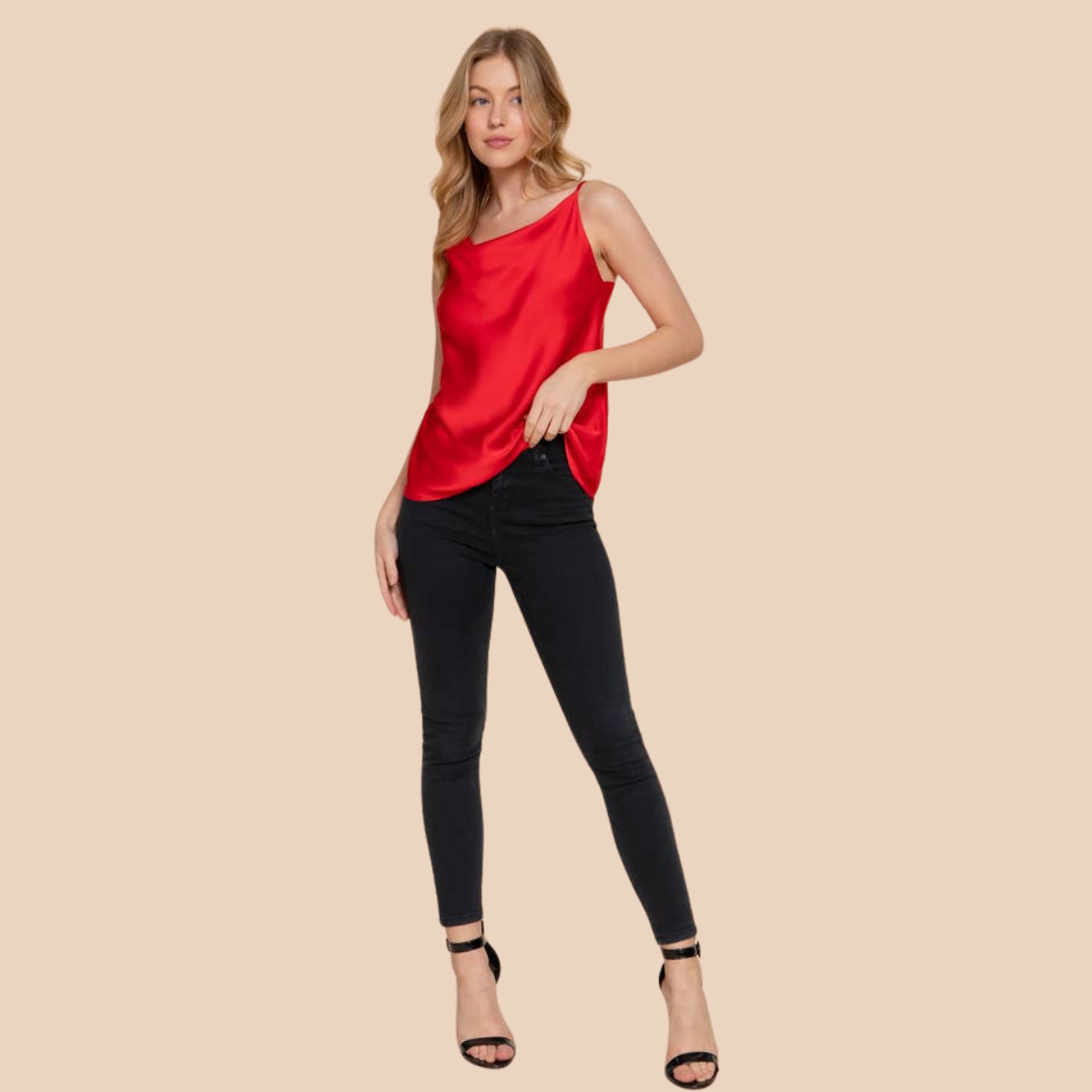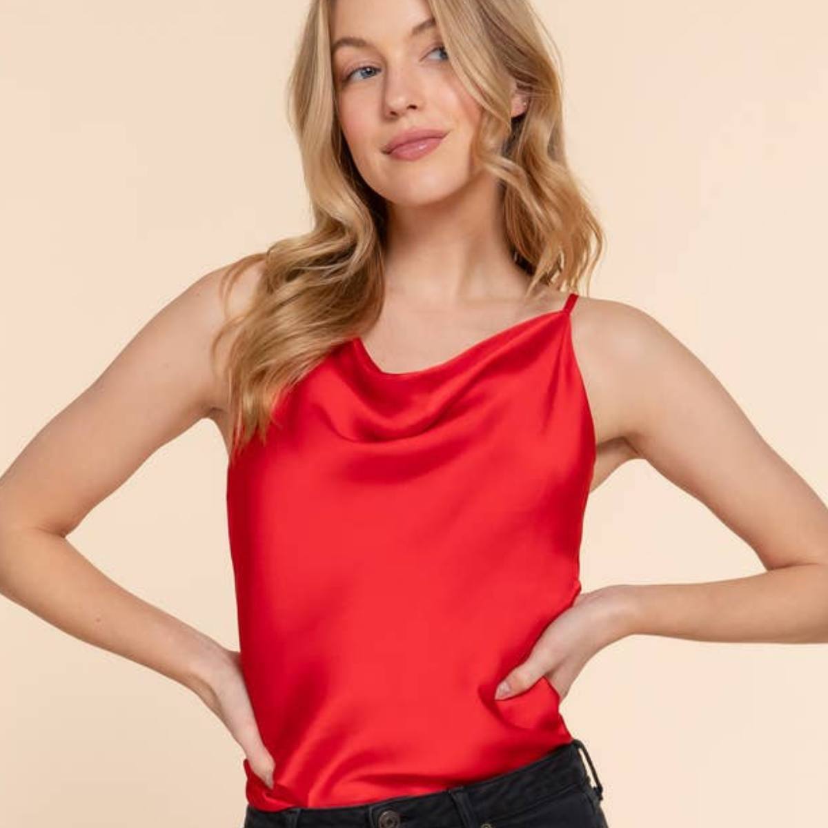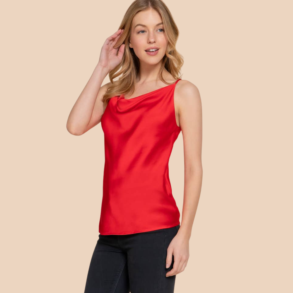 - Turn heads with this elegant silky red cowl neck cami, designed for effortless sophistication. The draped neckline adds a touch of romance, while the lustrous satin‑like fabric gives a luxurious sheen. Lightweight and versatile, it’s perfect for layering under blazers or pairing with skirts and denim for a chic evening look.