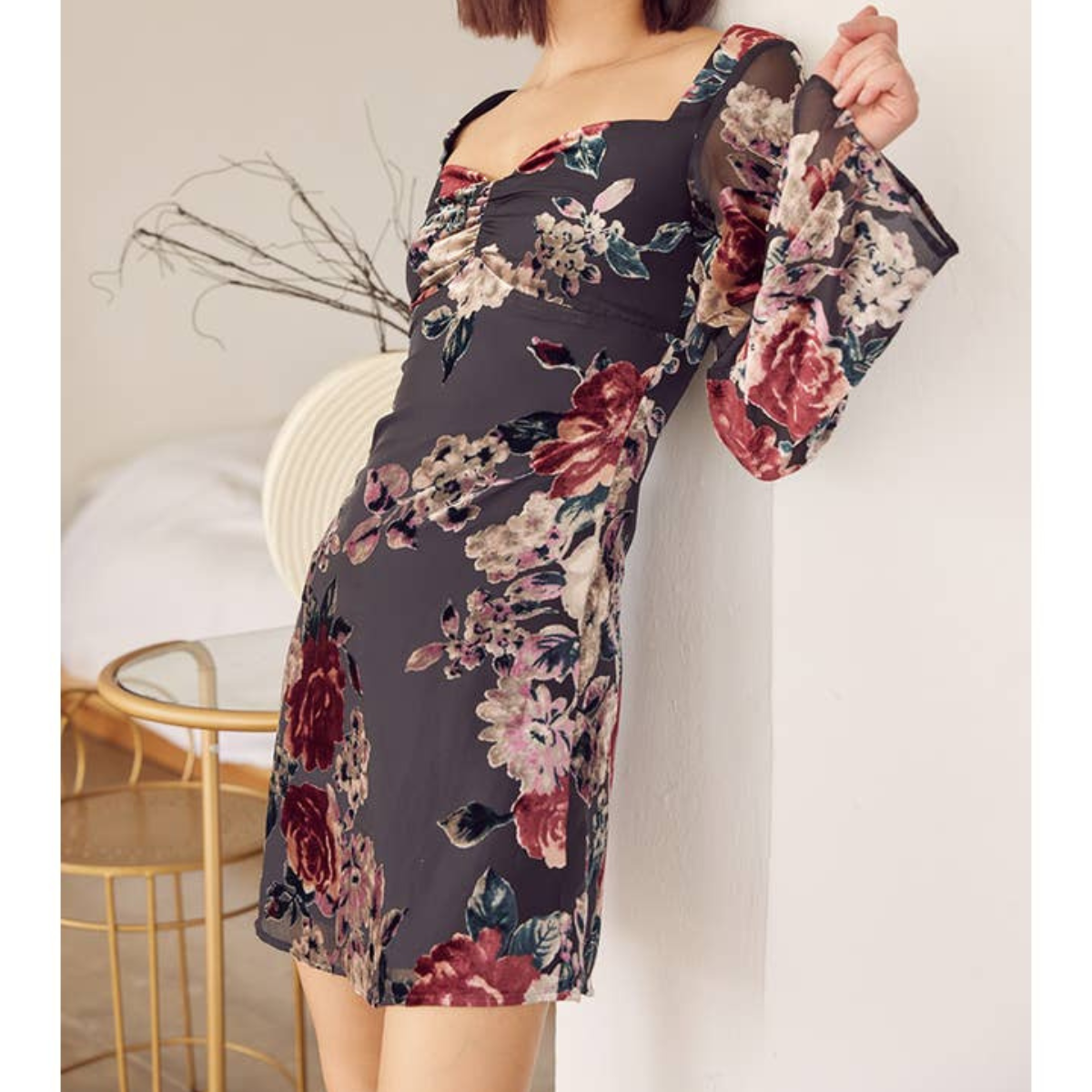 - The Isabella Dress showcases a moody floral print with a graceful sweetheart neckline and sheer long bell sleeves. A gently gathered bodice and figure-skimming midi length create a flattering, feminine silhouette. Elegant yet easy to wear, this dress is ideal for special occasions, evenings out, or elevated everyday style.