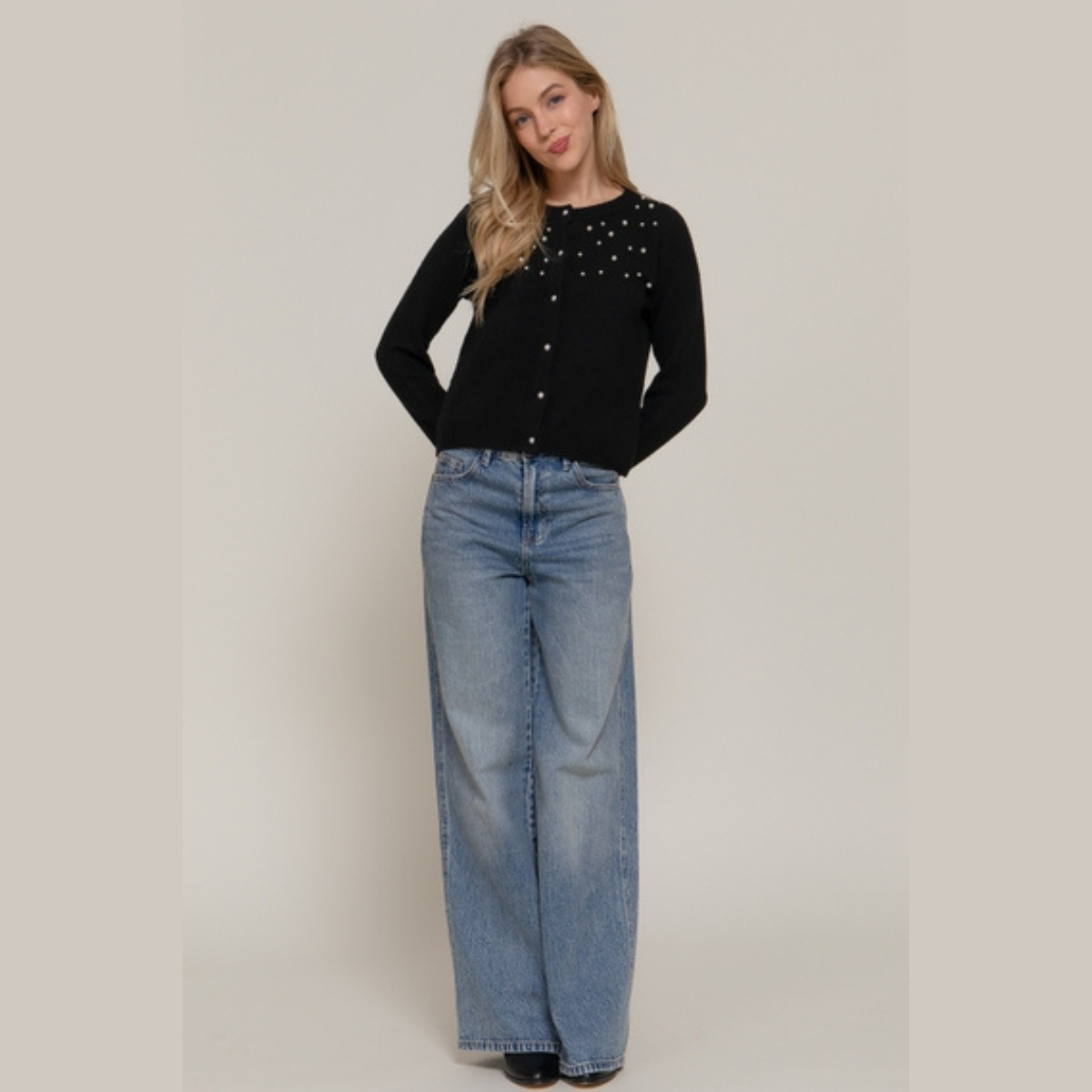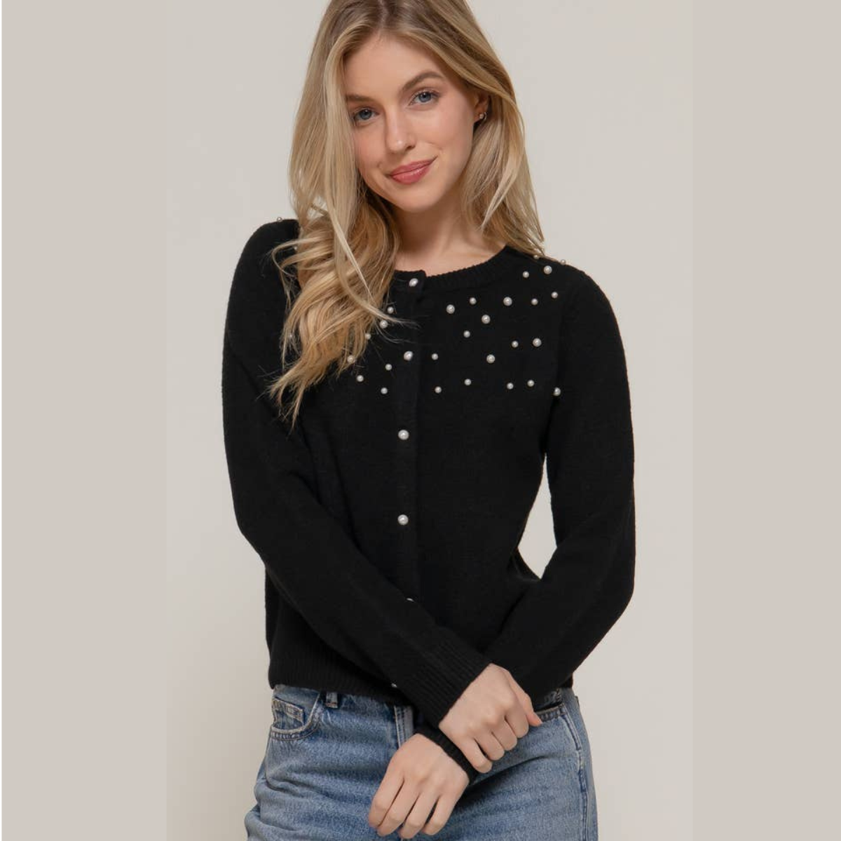 - The Farrah Sweater, a stylish and sophisticated cardigan was designed for effortless elegance. This black knit cardigan sweater features delicate pearl detailing on the front, adding a touch of glamour to a classic button-down style. Crafted from soft, breathable fabric, the Farrah Sweater offers all-day comfort while making a chic statement. Perfect for layering over casual outfits or to pair with a tank dress in the cold weather, this versatile cardigan is an essential addition to any fashion-forward closet.