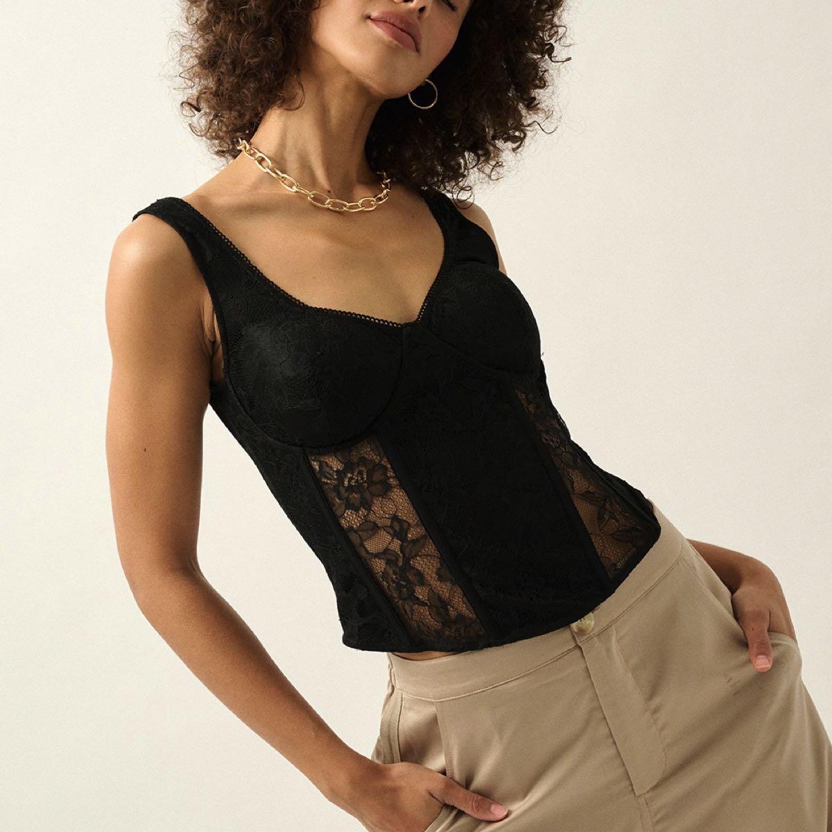 - Introducing the Alicia Corset, a corset top featuring intricate floral lace detailing. The scoop neckline and sleeveless design, coupled with delicate mesh floral lace panels on the bodice, create a captivating silhouette. The Alicia Corset boasts a fitted silhouette, enhancing your curves effortlessly. Available in both ivory and black, this corset top is a versatile addition to your wardrobe, perfect for any occasion.