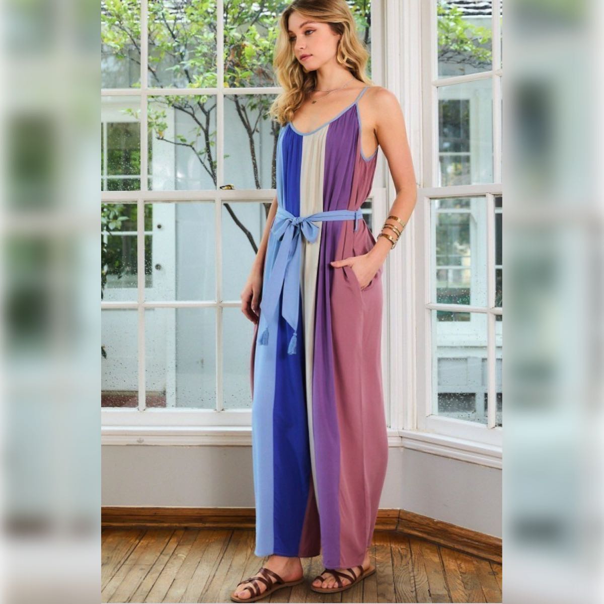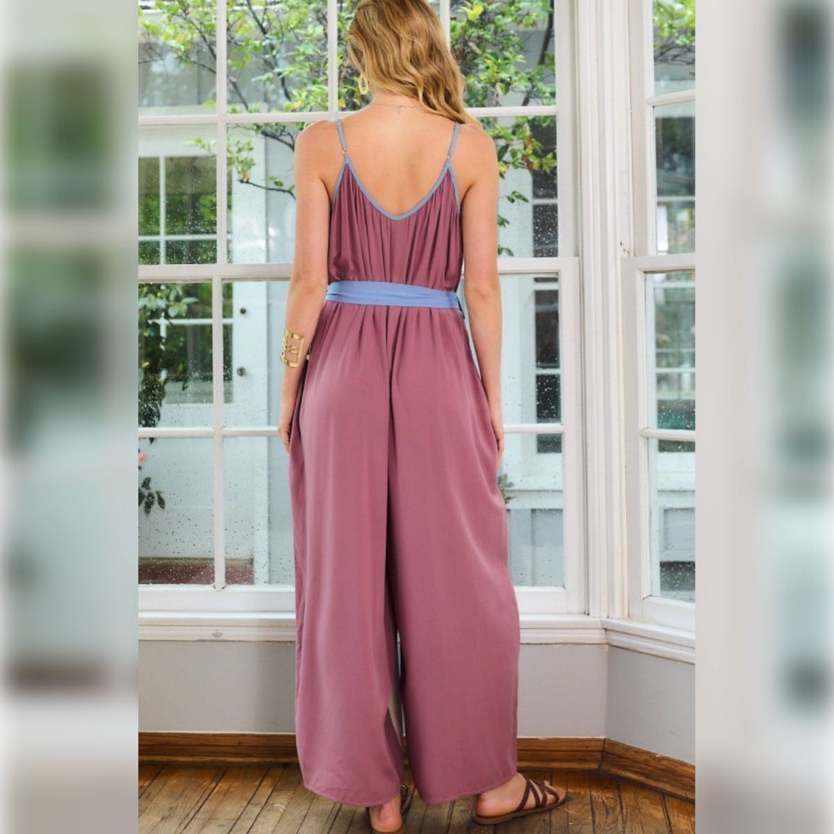 - Deep mauve, cobalt blue, cream ivory, and a deep lilac purple combine in a gorgeous combo in this fabulous jumpsuit. Featuring a rounded neck, and sash style belt this jumpsuit is super flattering and so chic. Perfect for a spring/summer special occasion if you are a wedding guest, or attending a baby/bridal shower or dress it down with casual styling options like flat sandals making the Cassie Jumpsuit the perfect versatile jumpsuit.